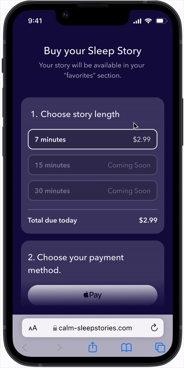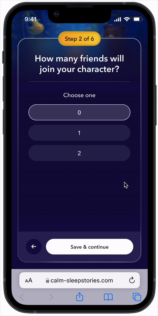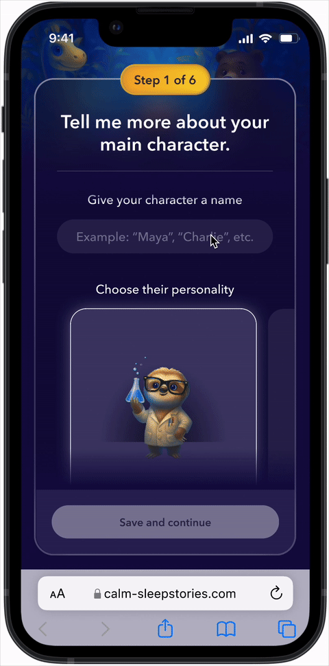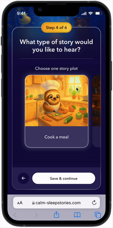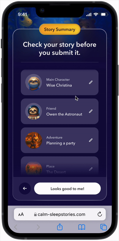I designed a 0 to 1 web-based sleep story creation experience that would allow kids to construct their own personalized sleep story. Upon providing a variety of story inputs, Calm would leverage AI technology to compose a custom sleep story for individual purchase. I crafted the entire experience, including E2E flow and comprehensive art direction.