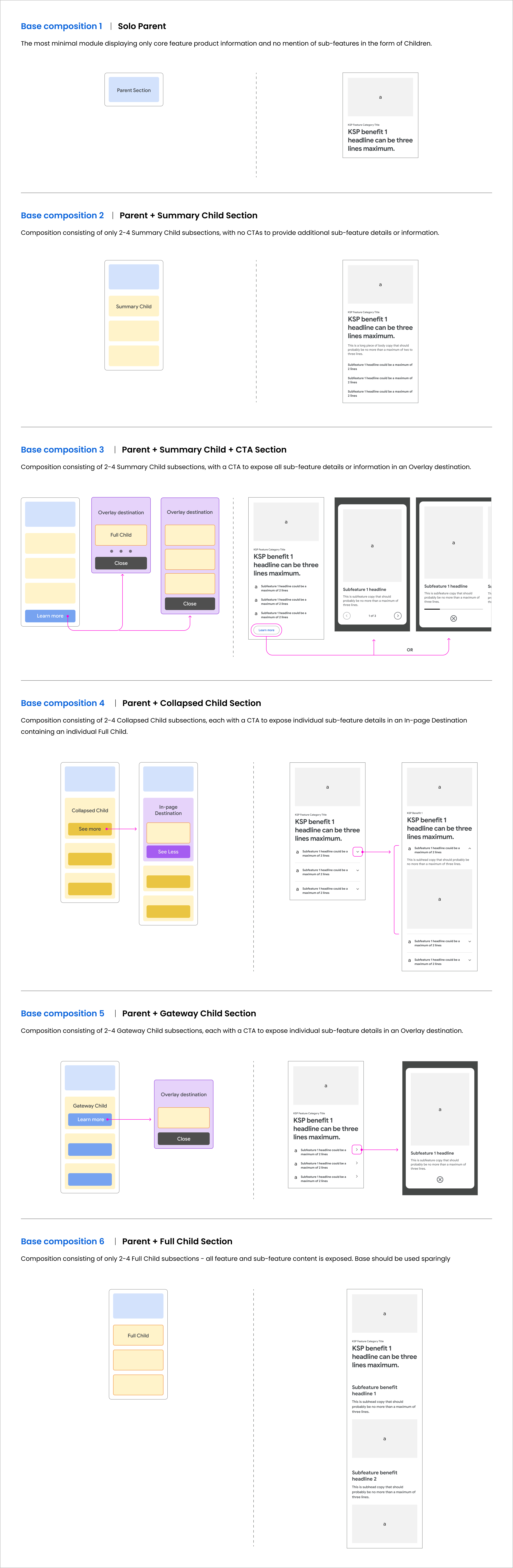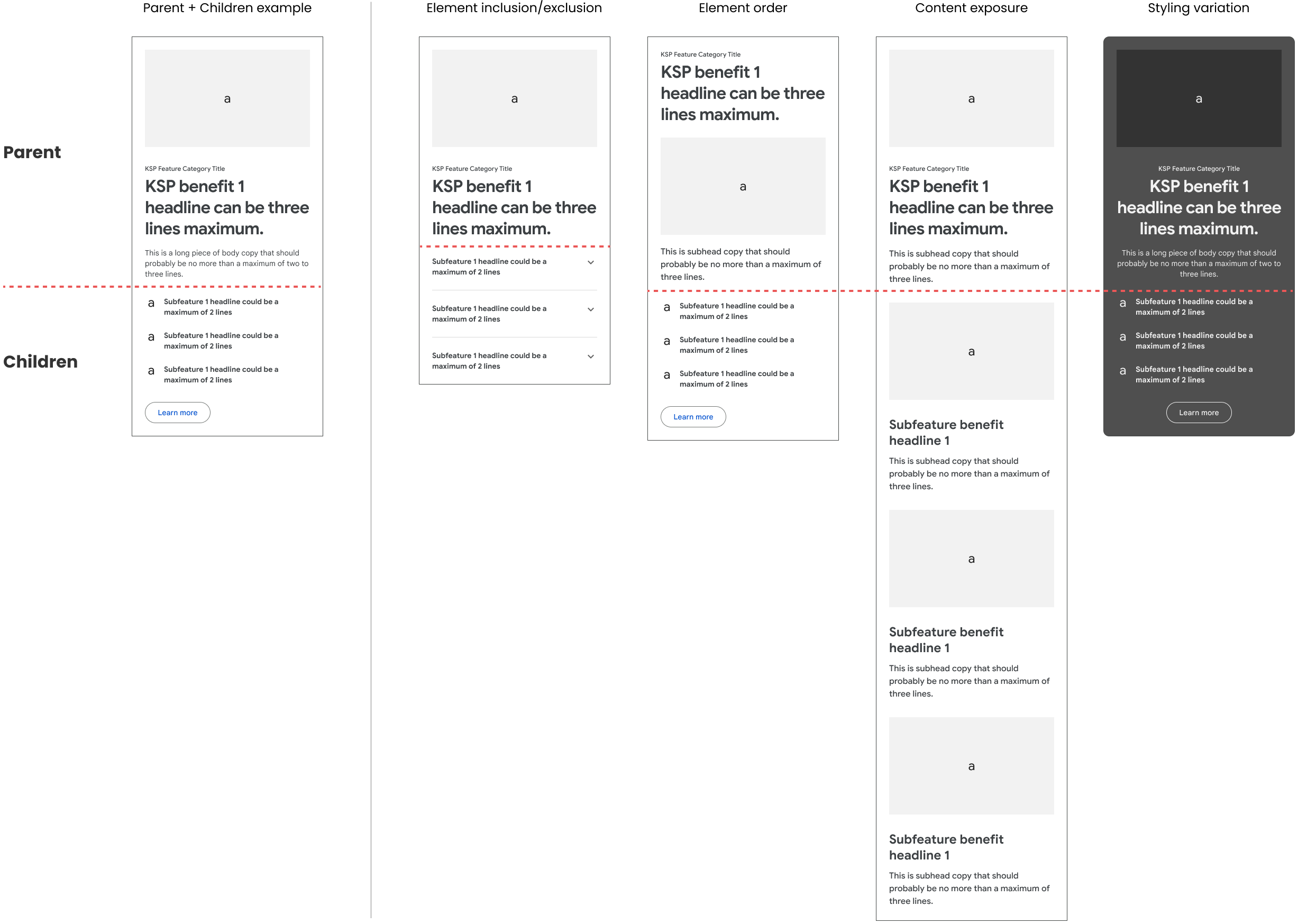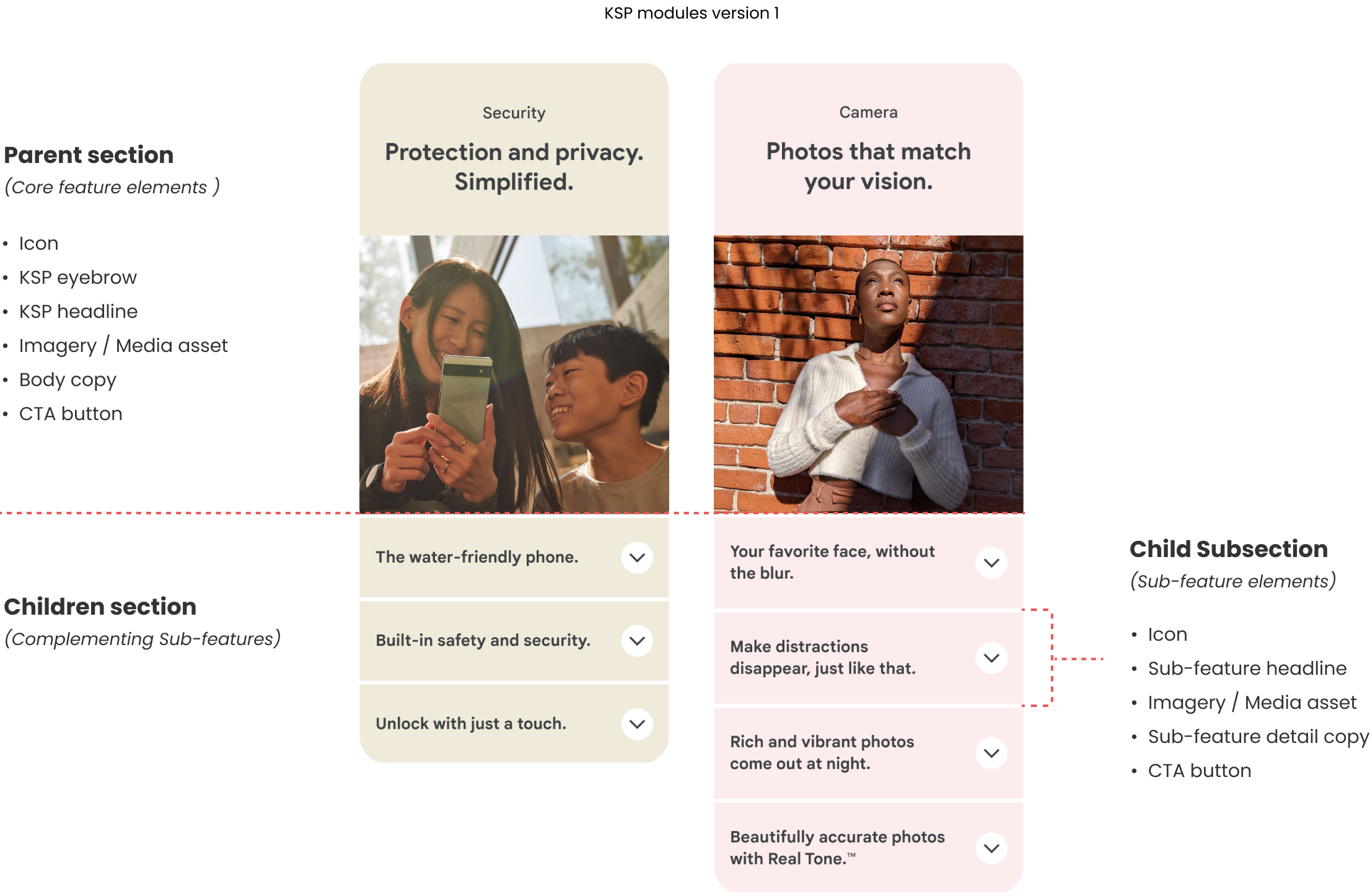 As a starting point, I took inventory of elements often used to compose KSPs so I understood what pieces could potentially be utilized in each module. I noticed that each KSP often contained elements that grouped into Primary and Secondary feature information. The Primary information pertained to core product feature content and the Secondary to sub-features that support the core feature. I chose to label these as “Parent” and “Children” sections.